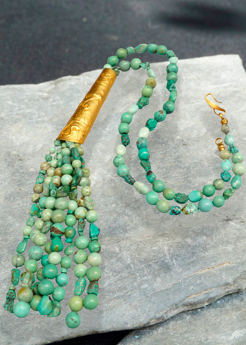 Collier long perles de turquoises, motif bronze doré à lor fin 24 carats (C.Tissot)