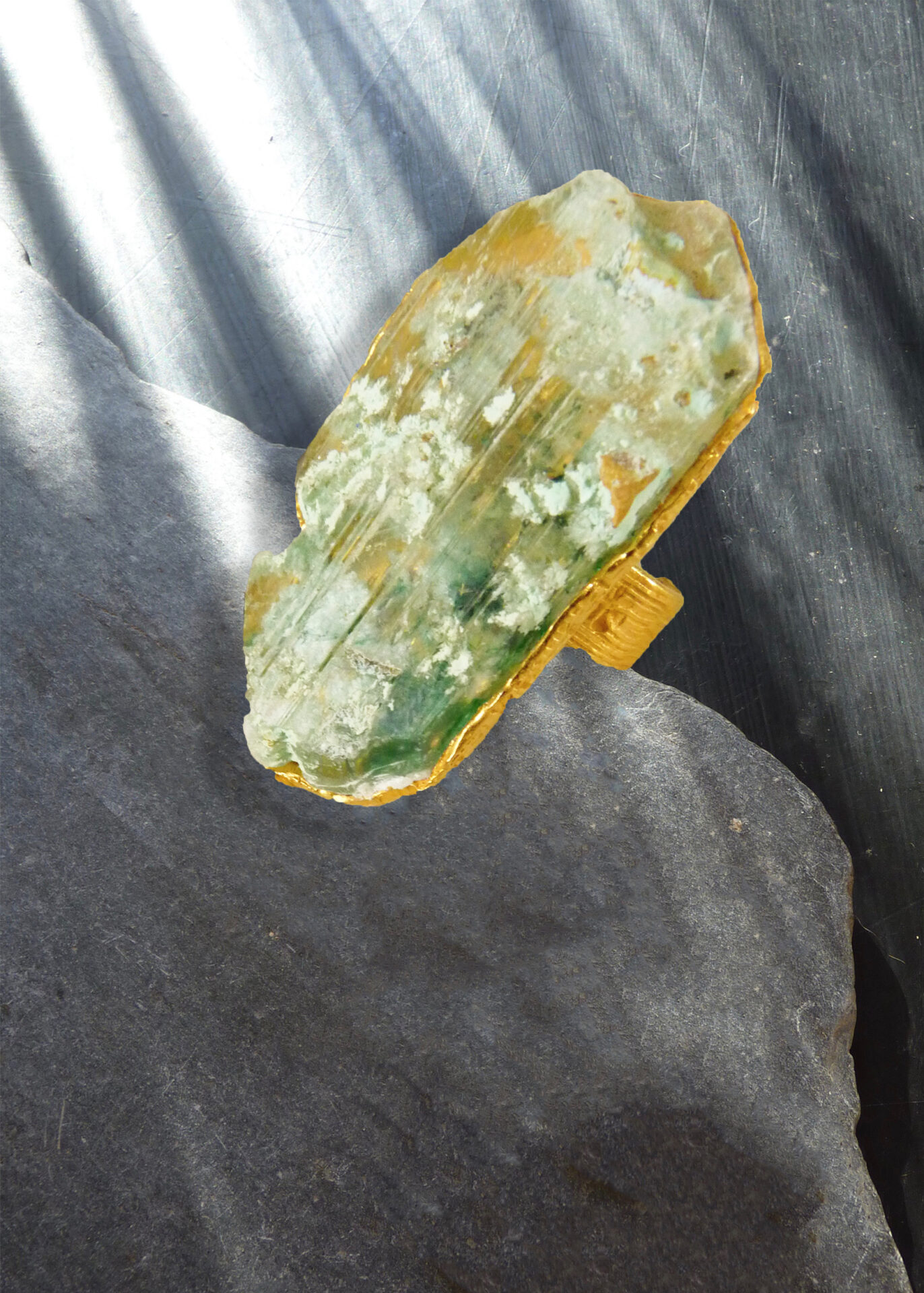 Bague quartz avec inclusions, bronze doré à l’or fin 24 carats Pièce unique