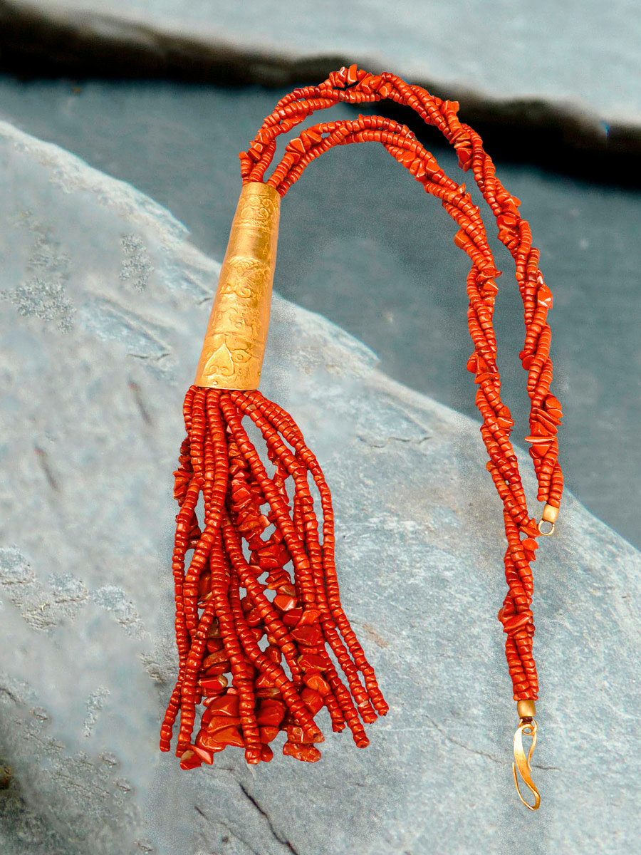 Collier long perles jaspe roux motif bronze doré à l’or fin 24 carats (C.Tissot)