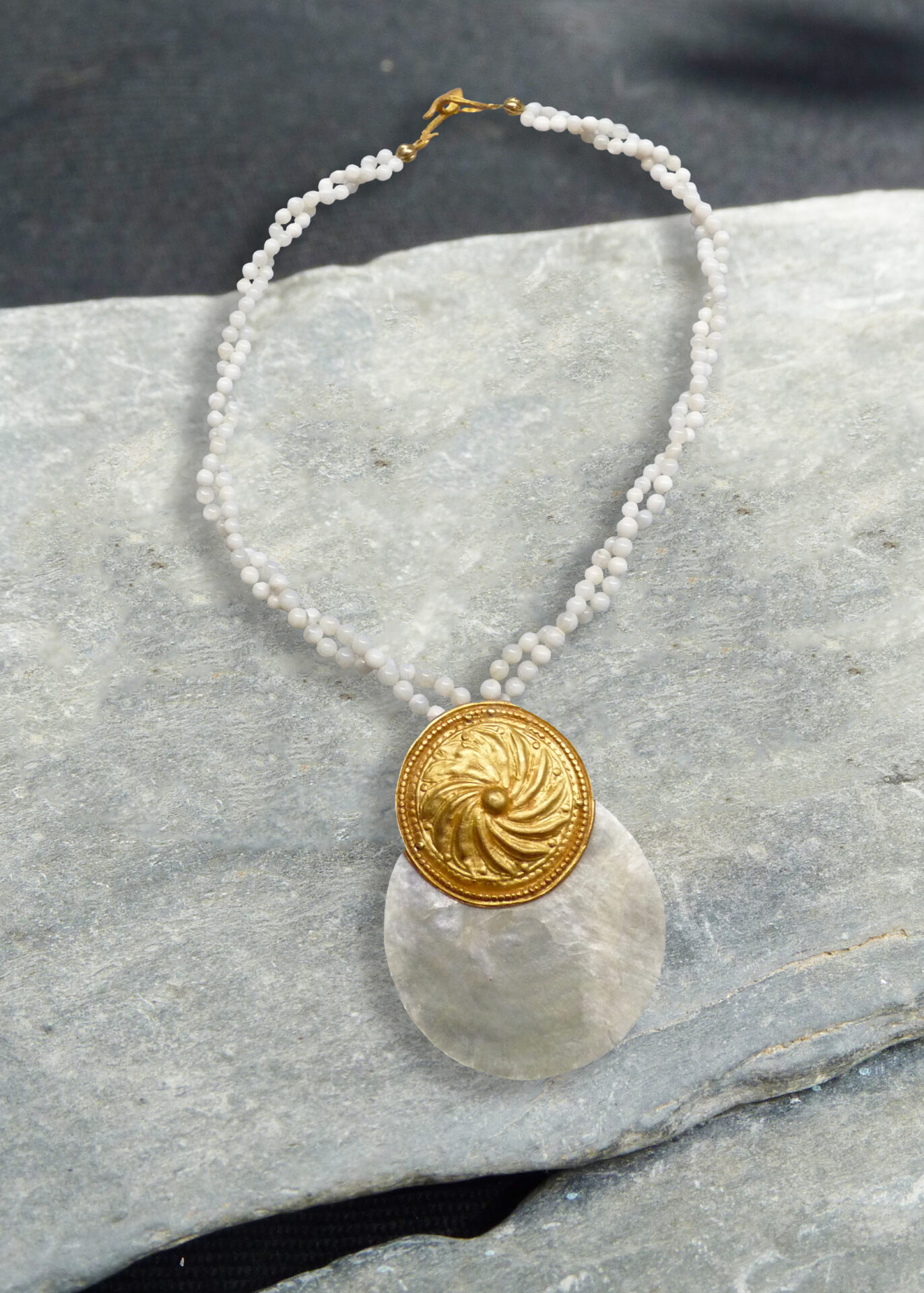 Collier pendentif, perles de nacre, bronze doré à l’or fin 24 carats                                                                                                                                                                                       Pièce unique